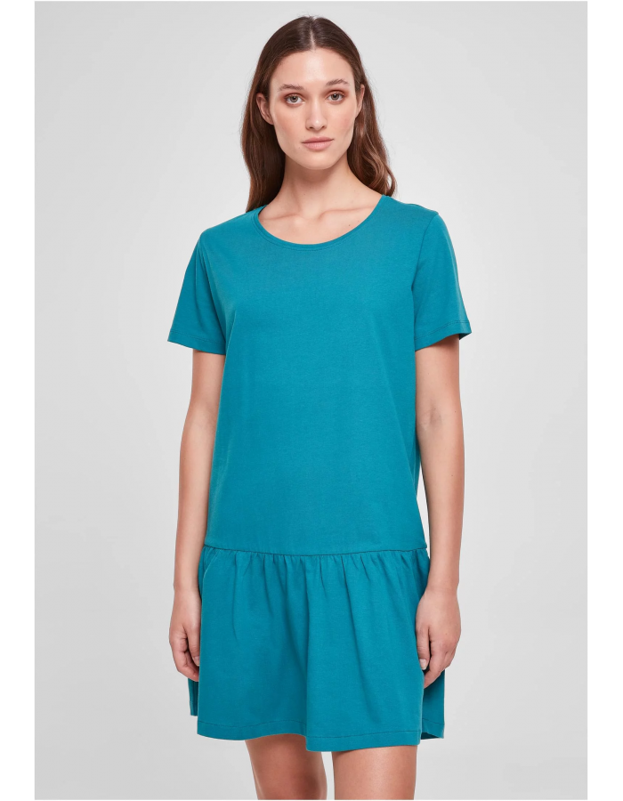 Široký střih a jednoduchý, ale efektní design tohoto dámského trička vypadá úžasně žensky. Krátké rukávy, volný střih i hluboký kulatý výstřih připomínají tvarem vyhlášeného trička. Volantový přístup sukně vytváří jemný akcent. Stejně snadný jako střih je materiál dámských šatů, který se skládá z hladkého single jersey.