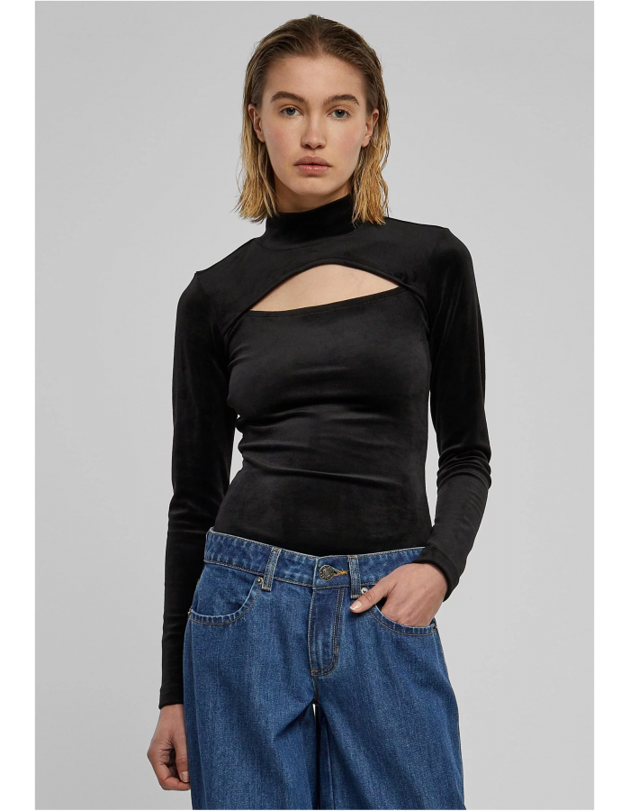 Body upoutá pozornost a vyznačuje se měkkým sametovým materiálem a vzrušujícím výstřihem s půlkulatým výstřihem nad hrudníkem. Dále onesie nabízí vysoký rolák a dlouhé rukávy. Střih je slim fit, a proto drží těsně u těla. O nazouvání a svlékání se starají knoflíky v rozkroku.