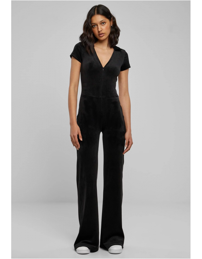 Tato kombinéza štíhlá a navržená s moderním střihem vykouzlí skvělou siluetu. Má také hluboký výstřih do V, který pokračuje zipem. Jemným detailem je límeček košile kolem krku. Styl završují mírně rozšířené dlouhé nohy. Díky sametovému materiálu onesie vzhled příjemně retro.