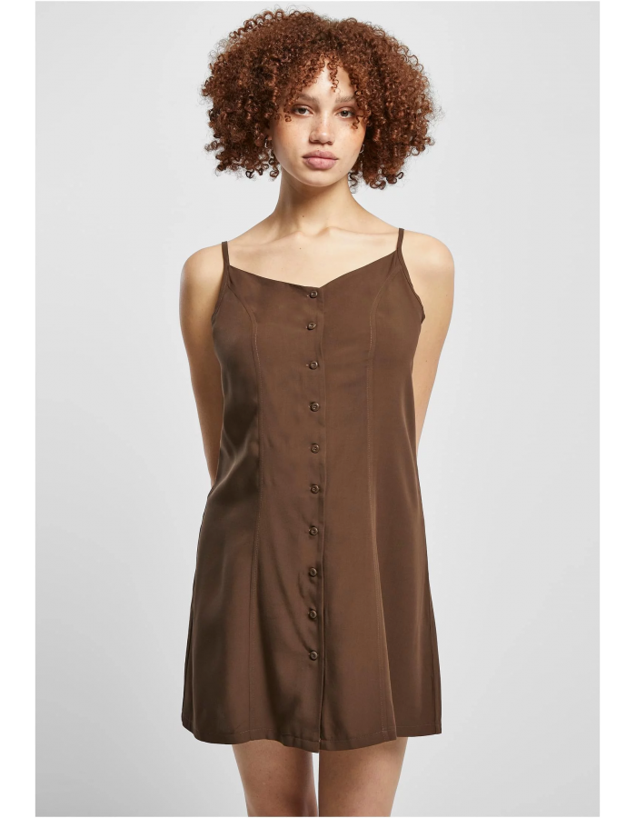 Tyto dámské minišaty s krátkým střihem, nastavitelnými špagetovými ramínky a hlubokým výstřihem na zádech jsou vrcholem letní módy. Šněrování vzadu dodává jemný akcent a přizpůsobený střih v kombinaci s úzkým střihem dodává šatům ženský nádech. Knoflíková léga na přední straně harmonicky završuje vzhled. Minišaty jsou mimochodem ušité z poddajné viskózy.