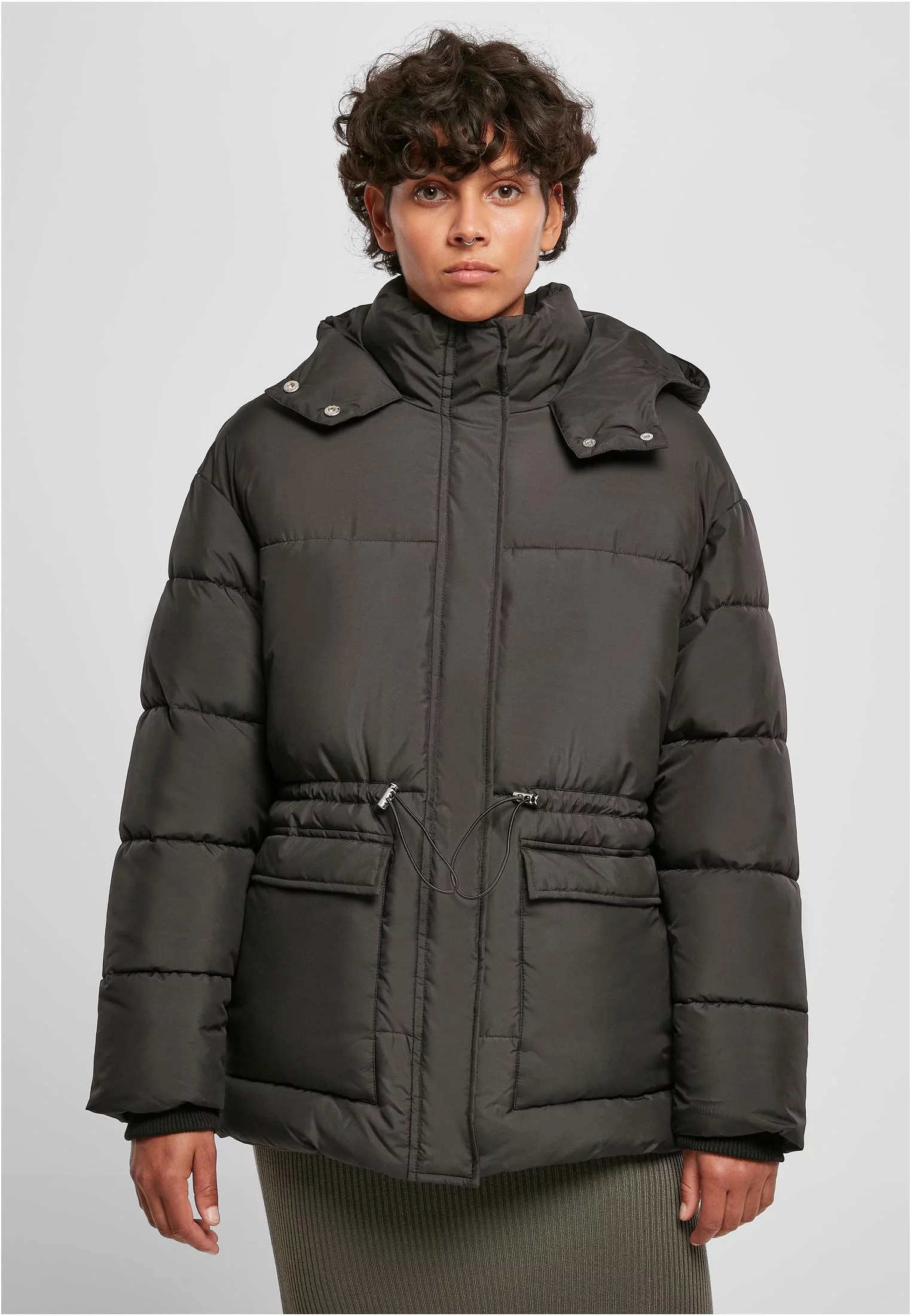 Tato dámská bunda je dokonale přizpůsobena pro chladnější dny. Polstrování a taftová podšívka udrží nositele v teple. Velká kapuce a stojáček poskytují dodatečnou ochranu, stejně jako široké žebrované manžety. Zimní bunda se zapíná na zip, který leží pod podšívkou s patentkami, zatímco stahovací šňůrky v pase dodávají tvar. Velké, našité boční kapsy s klopami a bočním přístupem jsou praktickým doplňkem a příjemný volný střih bundy i její spolehlivý materiál nabízejí bezpečné a jemné pohodlí při nošení.