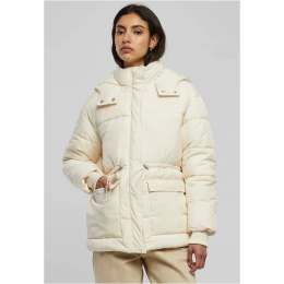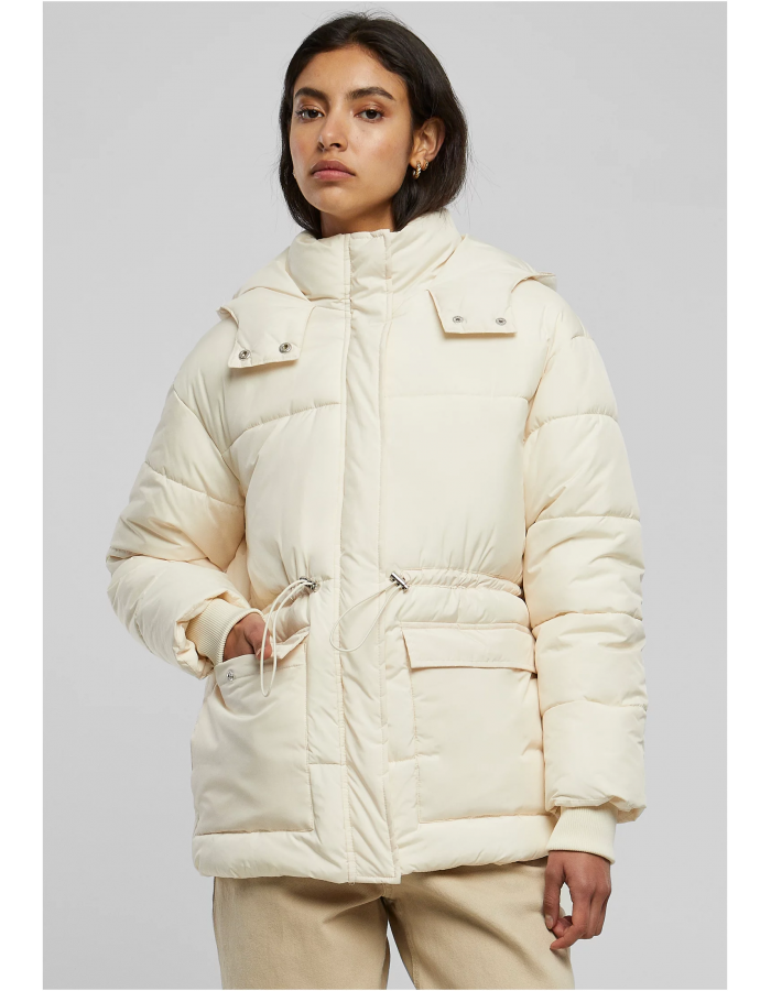 Tato dámská bunda je dokonale přizpůsobena pro chladnější dny. Polstrování a taftová podšívka udrží nositele v teple. Velká kapuce a stojáček poskytují dodatečnou ochranu, stejně jako široké žebrované manžety. Zimní bunda se zapíná na zip, který leží pod podšívkou s patentkami, zatímco stahovací šňůrky v pase dodávají tvar. Velké, našité boční kapsy s klopami a bočním přístupem jsou praktickým doplňkem a příjemný volný střih bundy i její spolehlivý materiál nabízejí bezpečné a jemné pohodlí při nošení.