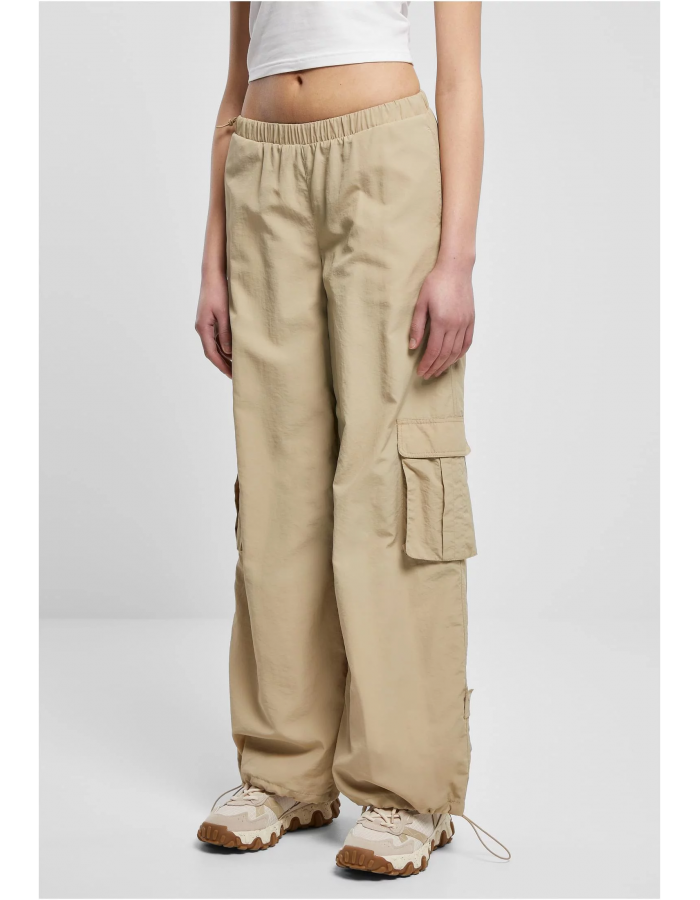 Široké a pohodlné kalhoty pro ženy kombinují balonové kalhoty s cargo stylem. Dodávají se s elastickým pasem se stahovacími šňůrkami a zarážkami, který sedí těsně nad boky. Elastické manžety jsou také opatřeny zarážkami, které vytvářejí široký tvar nabíraných kalhot. Úložný prostor se projevuje ve formě dvou bočních kapes a dvou zadních kapes s klopami – další cargo kapsy jsou umístěny ve výšce kolen. Materiál je vyroben z nylonové mačkané a střih je přirozeně volný.