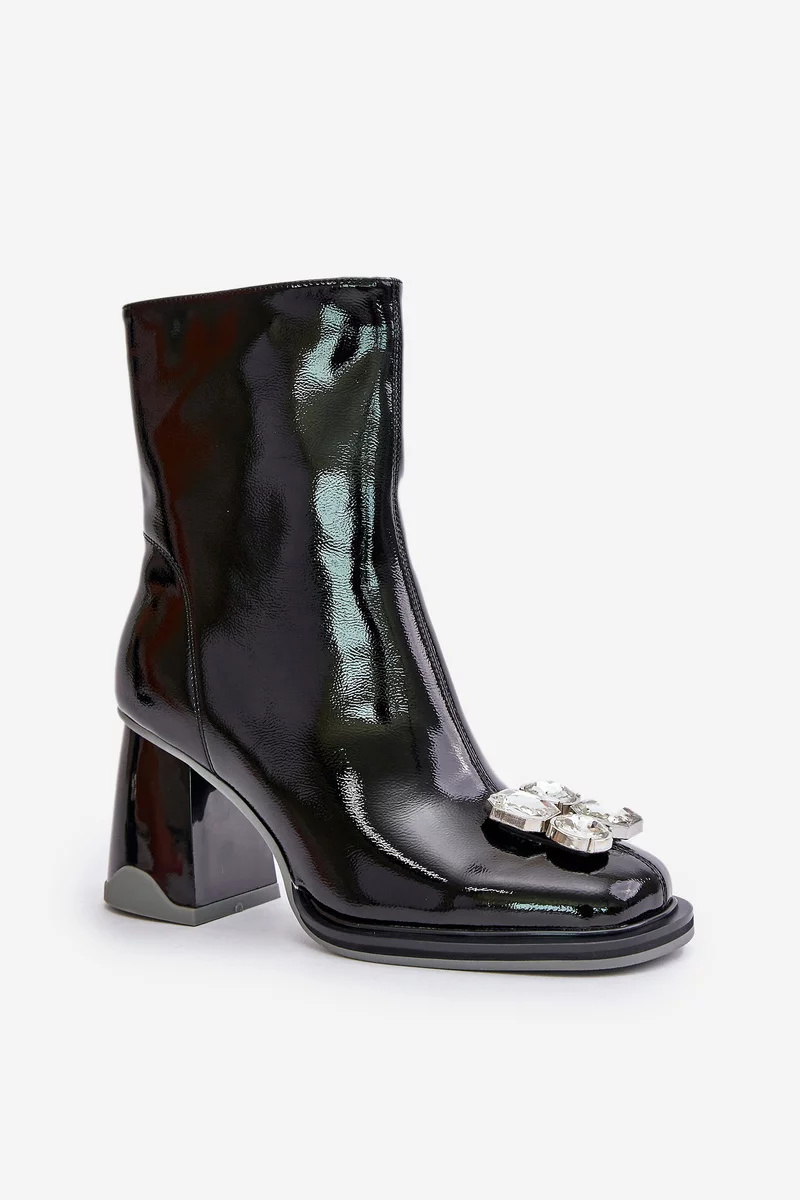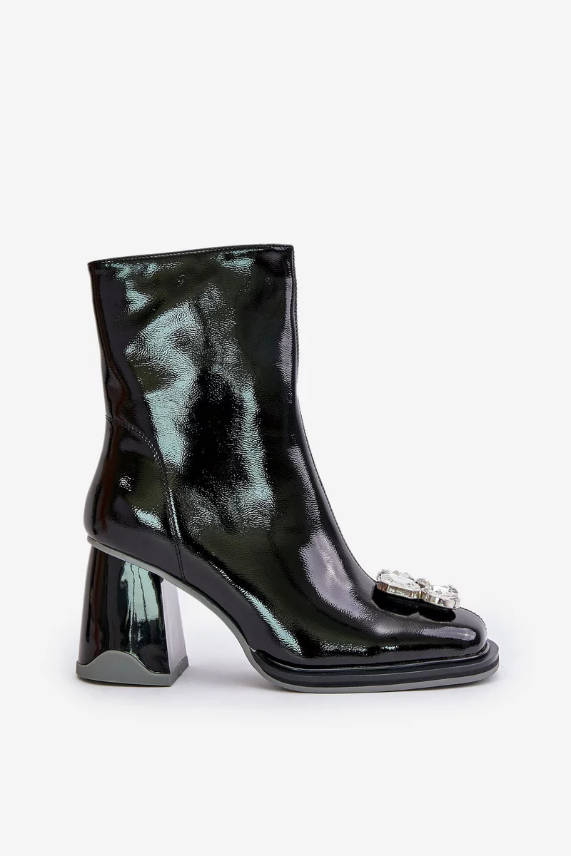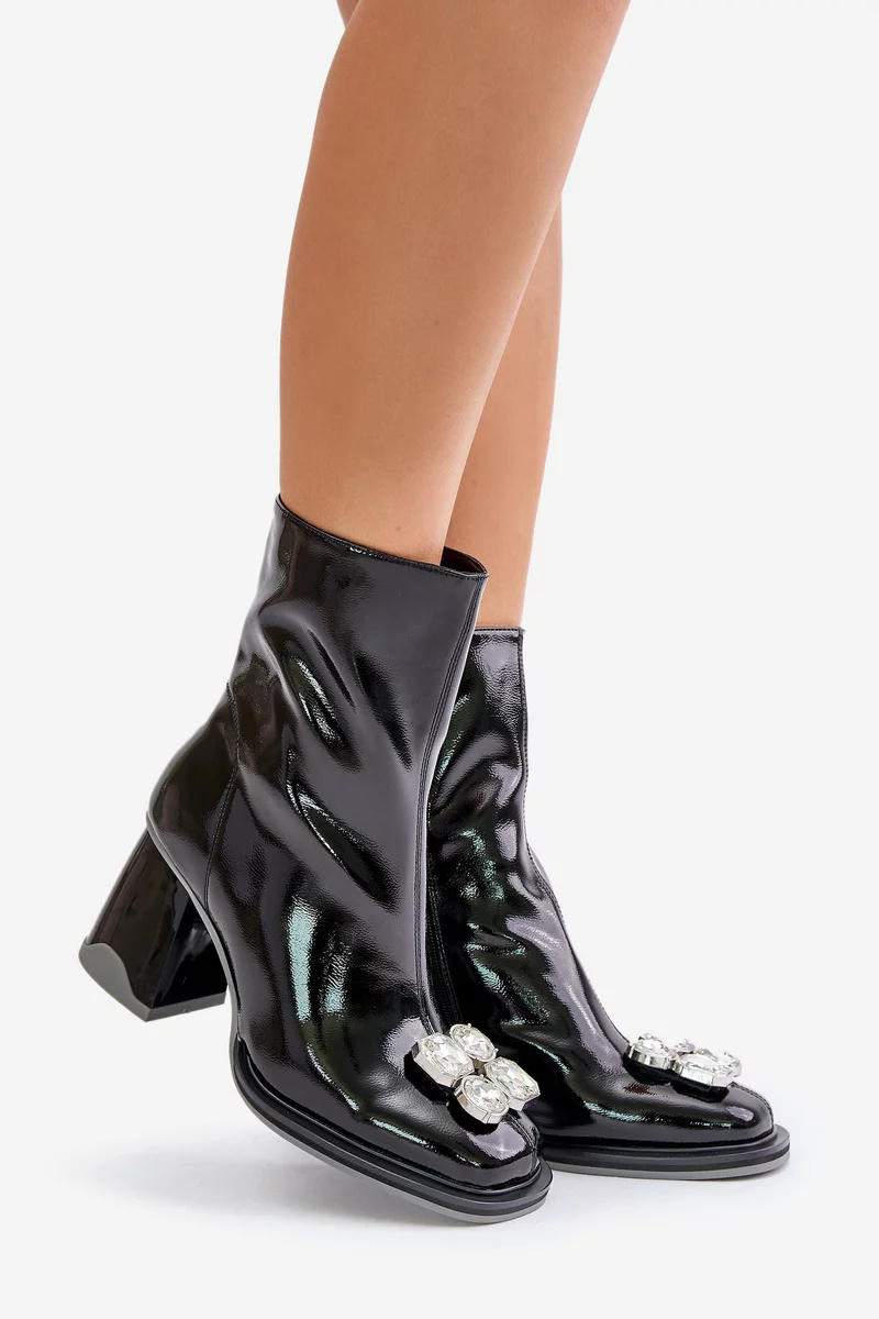 Dámské kotníkové boty vyrobené z vysoce kvalitní eko kůže, vpředu zdobené šperkovým akcentem.
