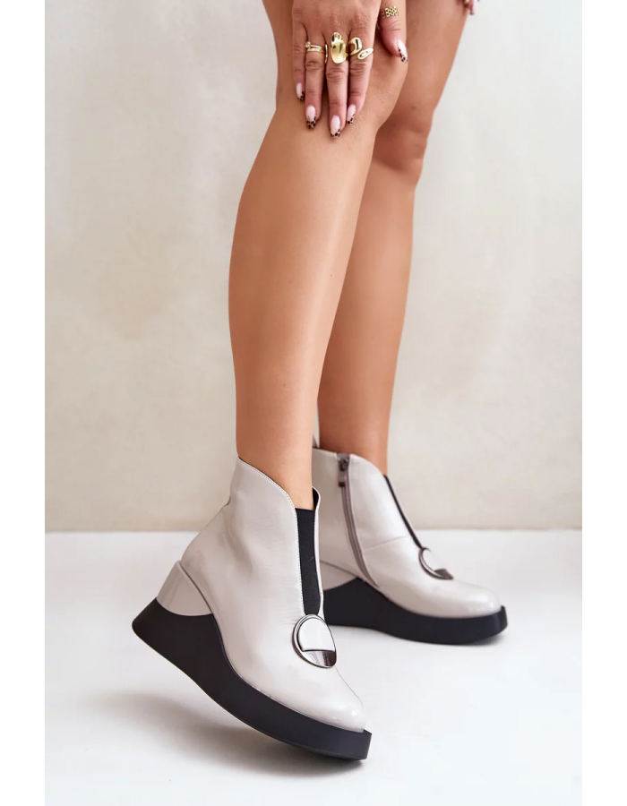 Elegantní dámské kotníkové boty na klínku a platformě. Vyrobeno z eko kůže. Zapínání na zip z boku. Zepředu elastická vsadka a ozdoba. Zaoblené špičky. Střed zateplený obuvnickou dekou. Tento model jistě doplní mnoho podzimně-zimních stylizací! Při výběru velikosti se prosím řiďte tabulkou velikostí.