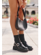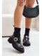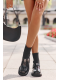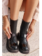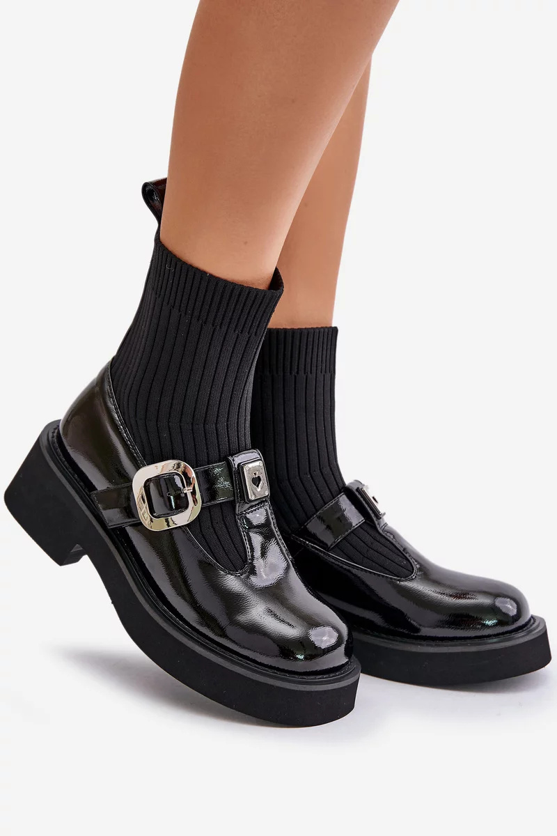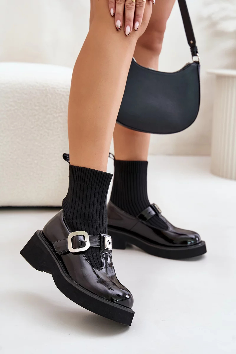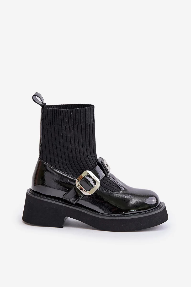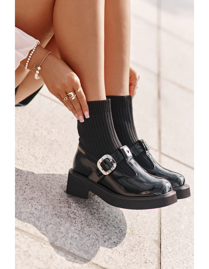 Lakované dámské kotníkové boty na nízkém, širokém podpatku a platformě. Svršek ve formě ponožky, navíc zdobený stylovým páskem s přezkou, jim dodává moderní charakter. Střed zateplený obuvnickou dekou pouze na výšce chodidla. Ideální do městských stylizací, spojují pohodlí s módním vzhledem. Při výběru velikosti se prosím řiďte tabulkou velikostí.
