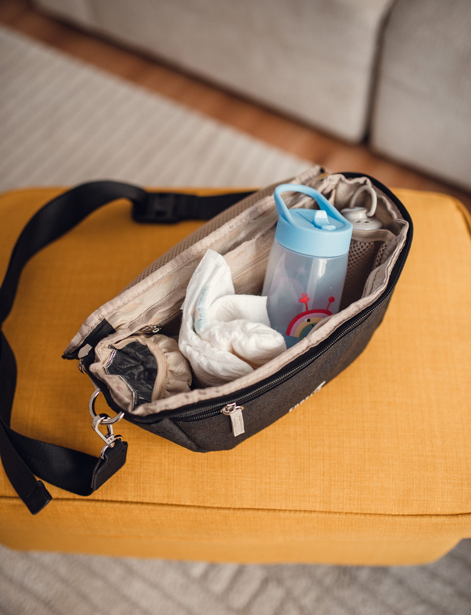 Malá, ale nepostradatelná. Tohle je ledvinka, kterou si připneš, vezmeš přes rameno nebo přicvakneš ke kočárku a máš všechno důležité hned po ruce. Klíče, telefon, peněženka – žádné hledání na dně tašky. Je lehká, odolná a navržená tak, aby držela krok s Tebou i během těch nejrušnějších dní.