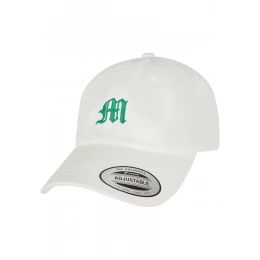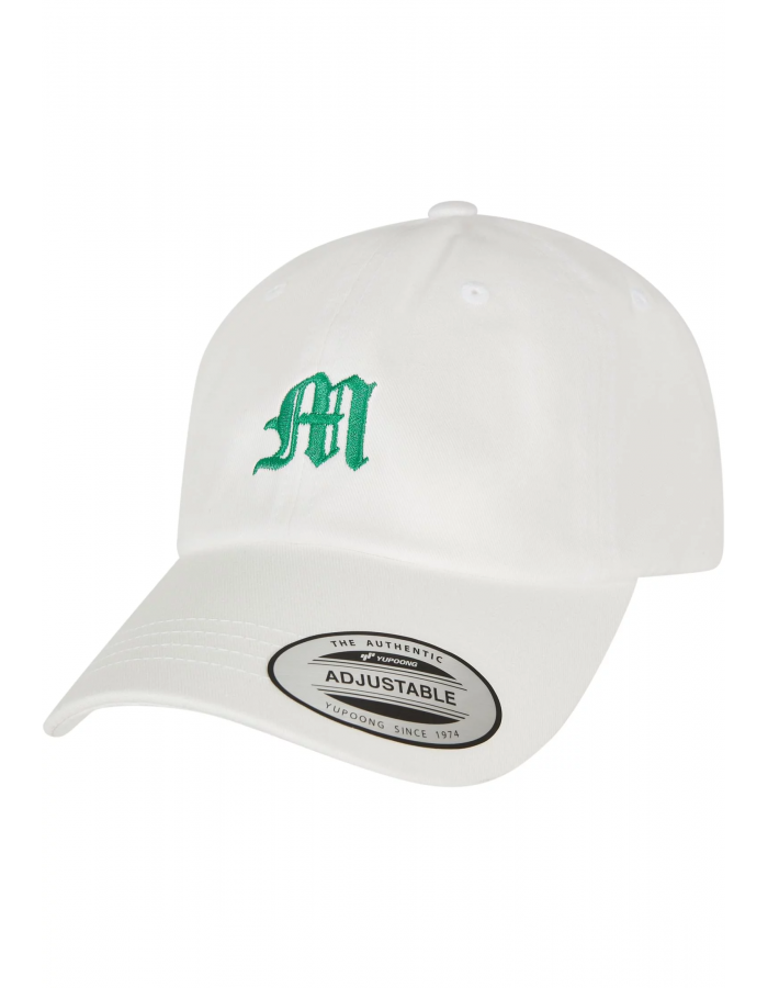 Jasné a pevné – design bílé kšiltovky se zaměřuje na jedno centrální velké písmeno nad zakřiveným hledím. Volba spočívá mezi písmeny A, L, M a S, každé ve staré škole kurzívou. Kšiltovka má také ozdobné švy na kšiltu a zapínání na zadní straně pro individuální nastavení velikosti. Čepice je univerzální velikosti a je vyrobena z pevného bavlněného materiálu.