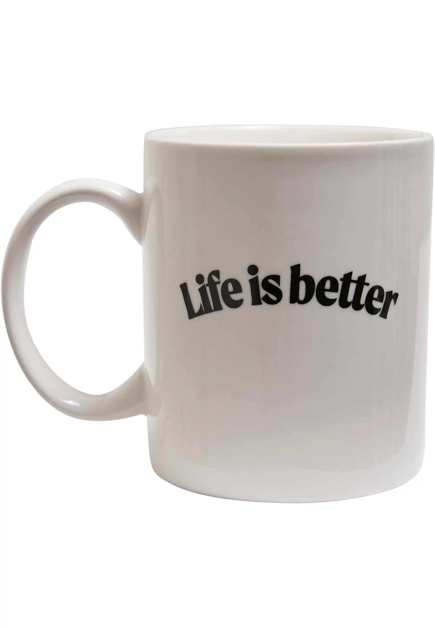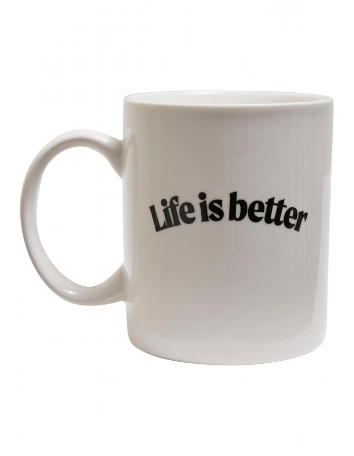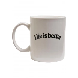 Na boční straně tohoto keramického hrnku je napsáno mírně zaobleným nápisem „Život je lepší“. Citát doplňují slova "Když piješ kávu" na spodní straně. Šikovný doplněk je vyroben z keramiky a nabízí velkou rukojeť.