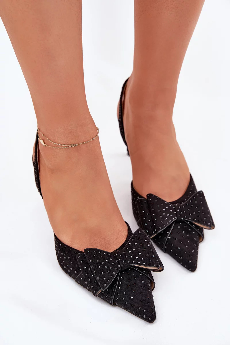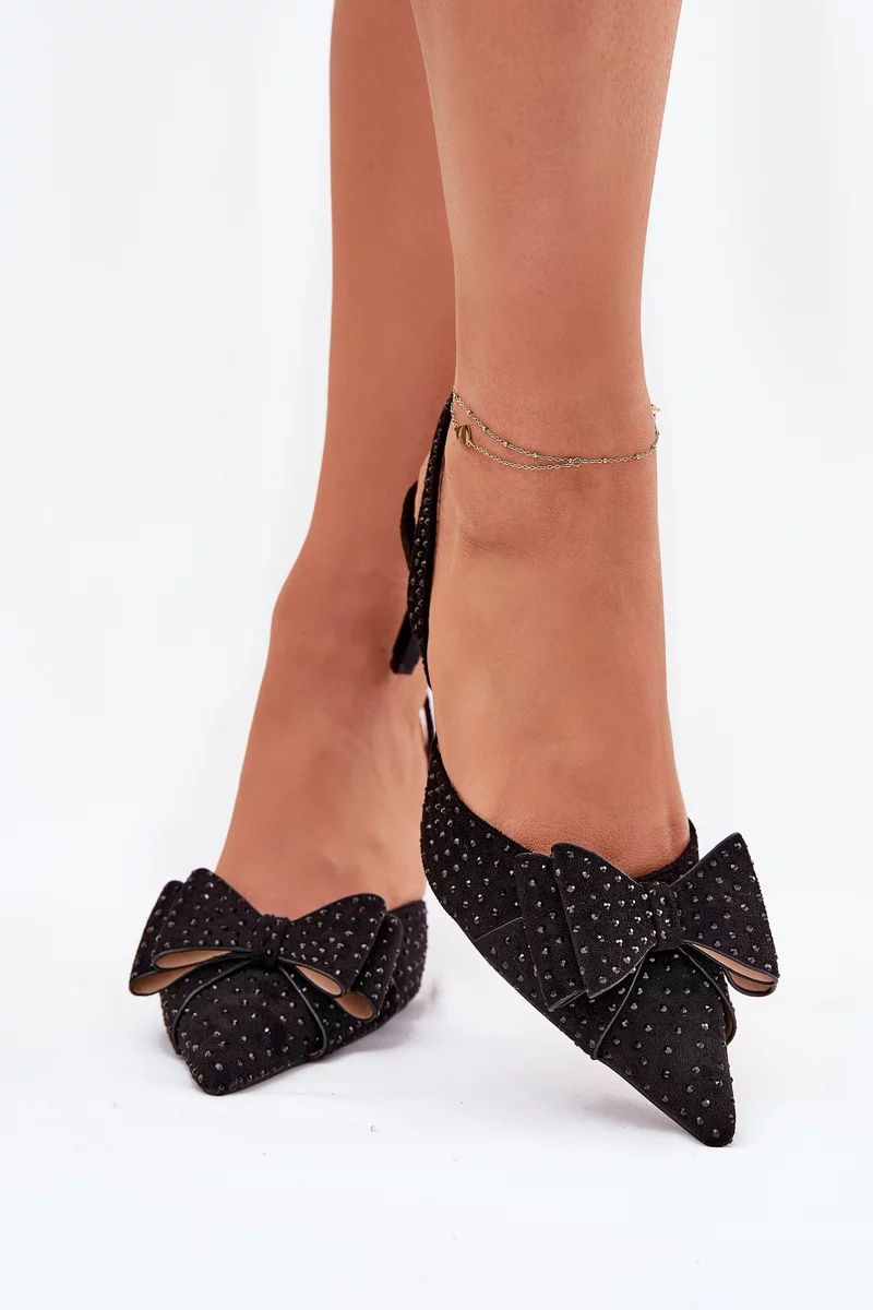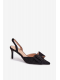 Elegantní dámské lodičky Nilandriela v černé barvě okouzlí jemnou mašlí na špičce a otevřenou patou, která dodává modelu lehkost a ženskost. Lesklé dekorace působí luxusně, zatímco pohodlný podpatek a měkká stélka zajistí komfort při nošení. Ideální volba na společenské události, večerní setkání i elegantní každodenní outfity.