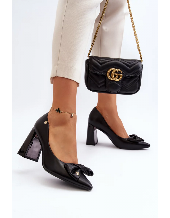 Elegantní lodičky se stabilním blokovým podpatkem jsou perfektní volbou pro mnoho příležitostí. Vyrobeny s důrazem na detail, mají měkkou a pohodlnou vložku z přírodní kůže, která zajistí pohodlí i při dlouhodobém nošení. Jejich špičaté špičky dodávají styl a jemný emblém po stranách svršku jim dodává sofistikovaný charakter. Přední strana zdobená mašlí. Tento model skvěle doplní každodenní i elegantní styly! Při výběru velikosti se řiďte tabulkou velikostí.
