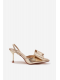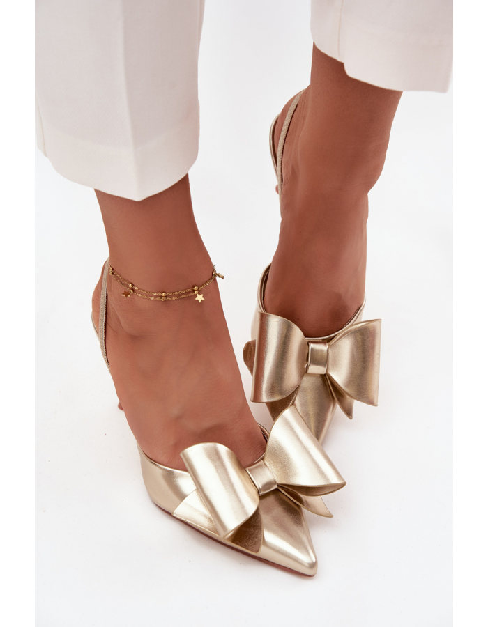 Elegantní dámské lodičky Eklevia v zlatém provedení s odkrytou patou a dekorativní mašlí kombinují slavnostní design, pohodlí a ženský vzhled. Špičatý tvar a střední podpatek opticky prodlužují nohy a dodávají sofistikovaný a výrazný look vhodný pro slavnostní příležitosti.