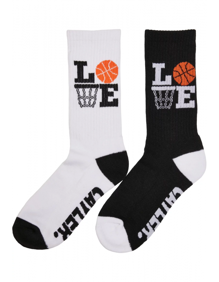 Dva páry chlazených ponožek Cayler s kontrastními podpatky a špičkami. Propletené „Láska.Nápis “ je pletený na dlouhém žebrovém hřídeli a doplněný nápisem „Cayler.“ nápis na chodidle. Základní barvy ponožek jsou černá a bílá. Látka se skládá ze směsi bavlny, polyesteru a spandexu a spodní strana je vyztužená.