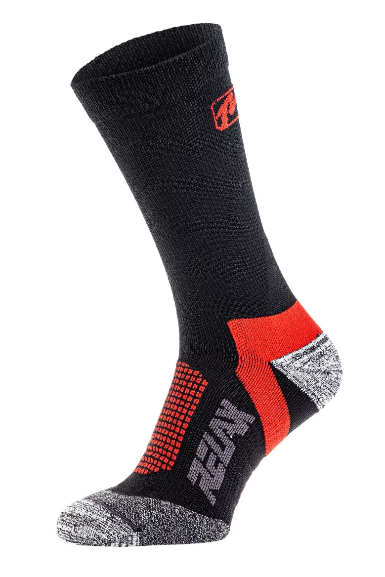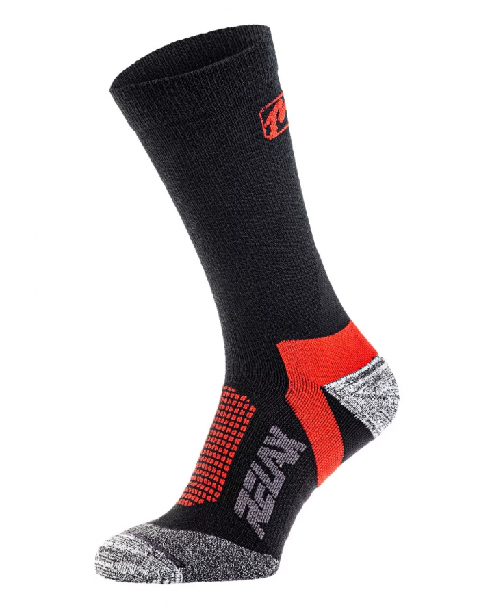 Highly efficient cross-country ski sock NORDIC with a combination of Merino wool and functional materials ensures a stable warmth at low temperatures, also provides an excellent thermoregulation by using MICROCLIMATIC technology. The sock is anatomically shaped for right and left leg, thereby allowing precise placement reinforcements in exposed areas. Instep protection is provided by KICKER spot technology, which decomposes excessive pressure and thus protects the cranial bones during impact. The elastic bandage in ankle area securely protects it and thus supports the natural movement of the foot in the boot