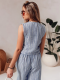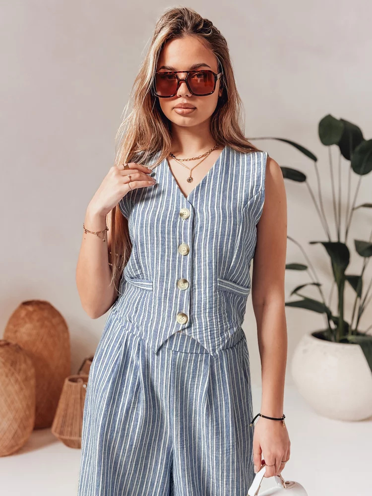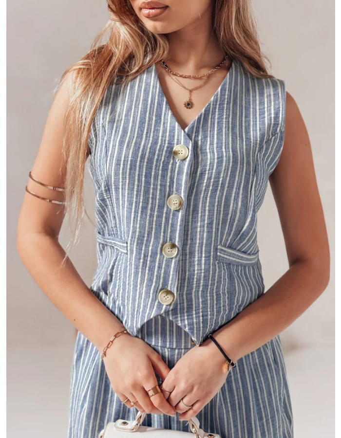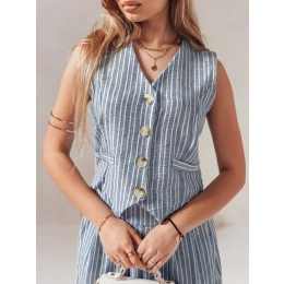 Letnia kamizelka to idealny wybór na cieplejsze dni. Model typu one size zapewnia komfort noszenia i swobodę ruchów. Zapinana z przodu na ozdobne guziki, posiada elegancki dekolt w serek oraz materiałowe paski po bokach, które podkreślają jej casualowy, wakacyjny charakter. Uniwersalny rozmiar pasuje od XS do L. Została wykonana z lekkiego, przewiewnego materiału, który sprawdza się doskonale w upalne dni.