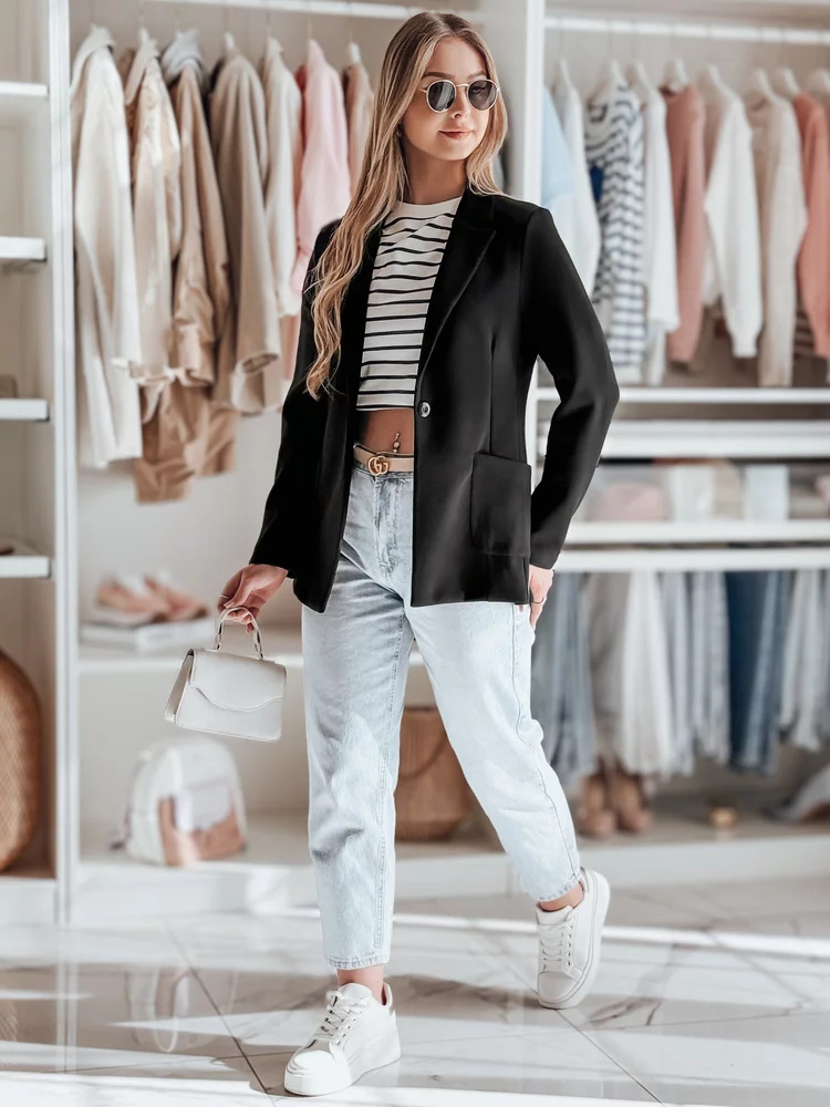 Stylowa marynarka o dopracowanym kroju, który świetnie dopasowuje się do sylwetki. Idealny wybór do codziennego looku, kiedy chcesz czuć się elegancko ale za razem komfortowo. Materiał o wysokiej jakości gwarantuje wygodę użytkowania, a ponadczasowy fason pozwala na tworzenie różnorodnych zestawów.
