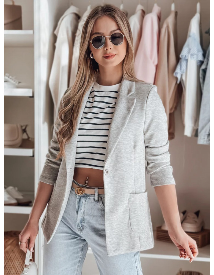 Stylowa marynarka o dopracowanym kroju, który świetnie dopasowuje się do sylwetki. Idealny wybór do codziennego looku, kiedy chcesz czuć się elegancko ale za razem komfortowo. Materiał o wysokiej jakości gwarantuje wygodę użytkowania, a ponadczasowy fason pozwala na tworzenie różnorodnych zestawów.