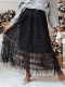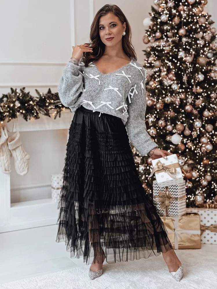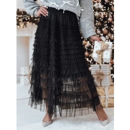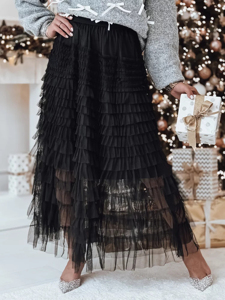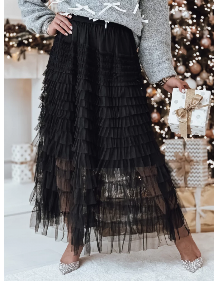 Stylová sukně o délce maxi, vyrobená z tylu, ozdobená jemnými volánky, které jí dodávají eleganci a lehkost. To je ideální návrh pro výjimečné příležitosti, kdy se chceš cítit žensky a elegantně. Lehce průsvitný materiál jemně odhaluje nohy, což celku dodává výjimečné kouzlo. Skvěle se hodí k elegantní halence a lodičkám, vytváří šik a romantický komplet.