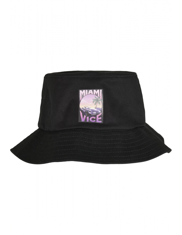 Klobouk typu bucket je o kontrastu – jednobarevný základní tón s křiklavým motivem „Miami Vice“ včetně sportovního vozu, palmy a městského panoramatu. To je doplněno typickými prvky, jako je šikmý okraj s ozdobnými švy a větracími otvory. Čepice je univerzální velikosti a je vyrobena z bavlny a elastanu