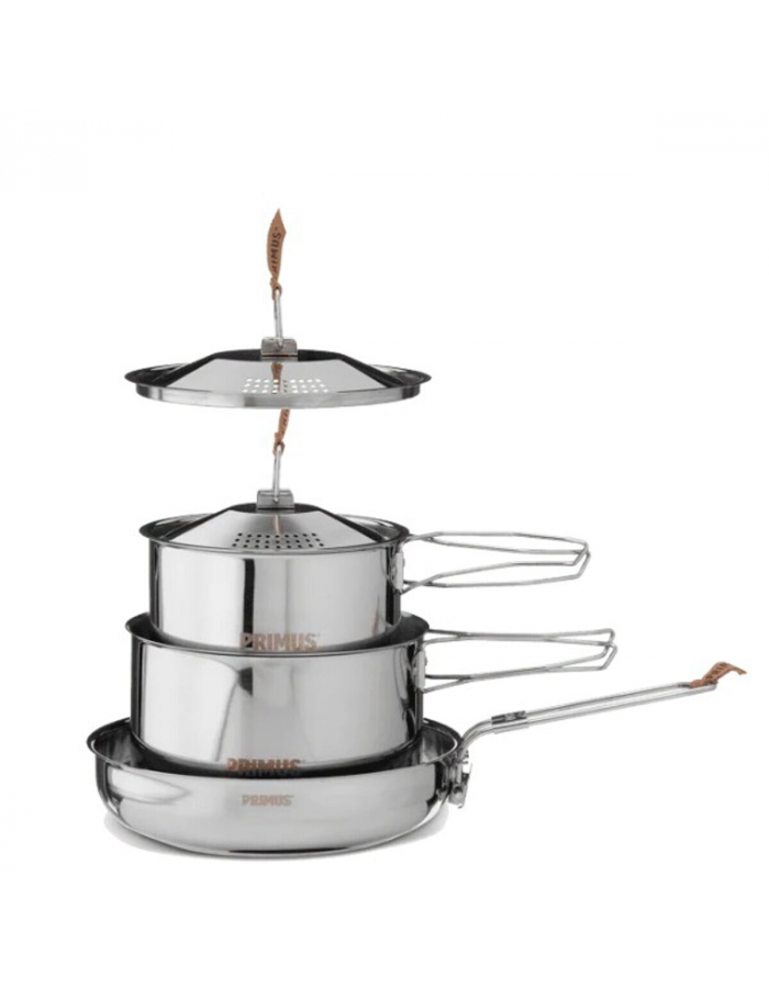 PRIMUS CampFire Cookset S.S. Small je robustní sada hrnců a pánví z nerezové oceli pro vaření a to i na otevřeném ohni. Perfektní sada hrnců a pánví pro vaše kempovací kuchařské dobrodružství. Tato kolekce obsahuje vše, co potřebujete k vytvoření kulinářských mistrovských děl na otevřeném ohni nebo na kempingovém vařiči, a zároveň se snadno skládá do sebe a balí do stylového vaku. Tato sada se skládá z 1,8 litrového Campfire hrnce, 1,0 litrového Campfire hrnce a Campfire pánve. Použijte Campfire hrnec (v tradičním tvaru hrnce) pro dokonale dušené polévky, dušená masa a vydatná teplá jídla. Campfire hrnec může ohřát omáčku na těstoviny nebo vodu na ranní kávu, zatímco Campfire pánev může usmažit snídani nebo restovat večerní omáčku či zeleninu. Všechny hrnce a pánve jsou vyrobeny z nerezové oceli 18/8 a mají skládací rukojeti, díky nimž je vaření, čištění a následné balení a skladování hračkou. Pokličky obou hrnců mají integrovaný cedník a kožené poutko, které umožňuje sejmutí pokličky z horkého hrnce.