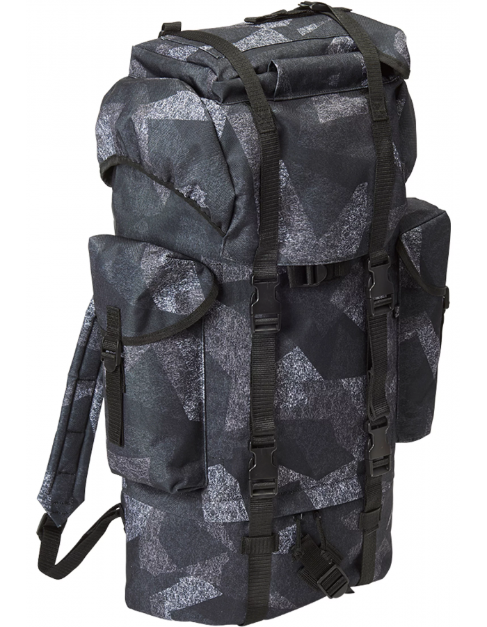 Tento robustní a velký vojenský batoh má objem až 65 litrů a má velké množství přihrádek pro maximální funkčnost. Prostorný hlavní oddíl rozšiřují oddíl na boty ve spodní části a pouzdro v horní části. Boky nabízejí dvě další přihrádky, vybavené vysoce kvalitními přezkami. Dva paralelní pásové popruhy s vysoce kvalitními klipsy stabilizují bojový batoh, zatímco polstrované a velikostně nastavitelné popruhy nabízejí schválené pohodlí při nošení. Vojenský batoh je vyroben z robustního nylonu odolného proti roztržení.