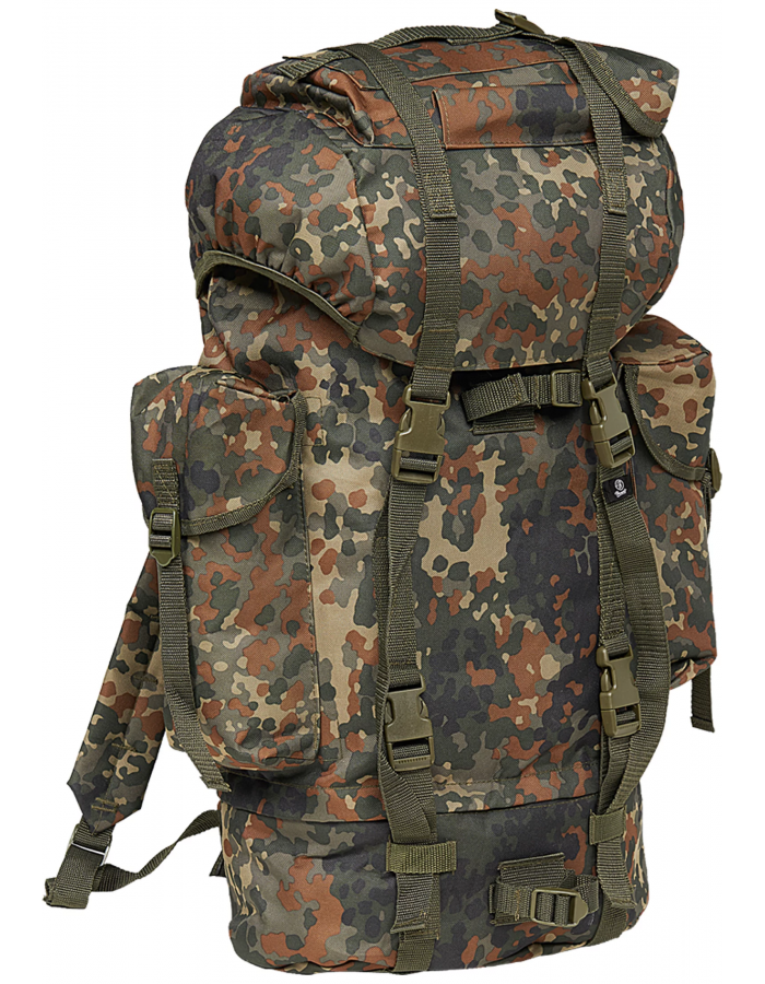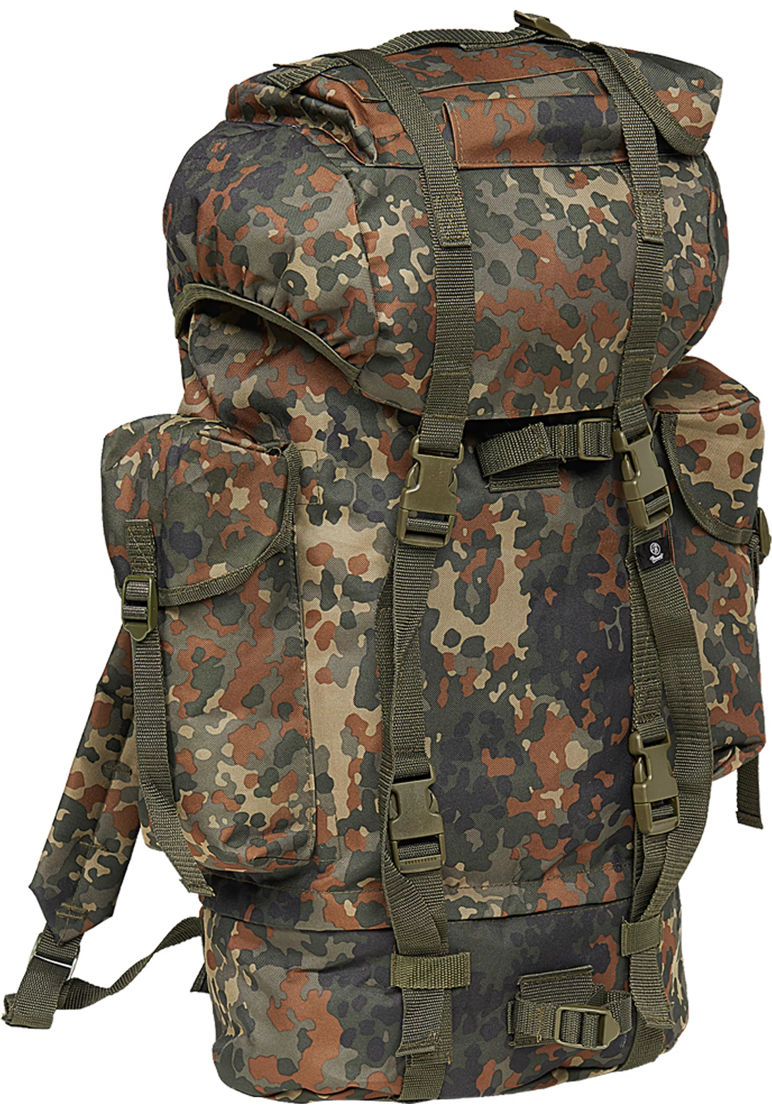 Tento robustní a velký vojenský batoh má objem až 65 litrů a má velké množství přihrádek pro maximální funkčnost. Prostorný hlavní oddíl rozšiřují oddíl na boty ve spodní části a pouzdro v horní části. Boky nabízejí dvě další přihrádky, vybavené vysoce kvalitními přezkami. Dva paralelní pásové popruhy s vysoce kvalitními klipsy stabilizují bojový batoh, zatímco polstrované a velikostně nastavitelné popruhy nabízejí schválené pohodlí při nošení. Vojenský batoh je vyroben z robustního nylonu odolného proti roztržení.