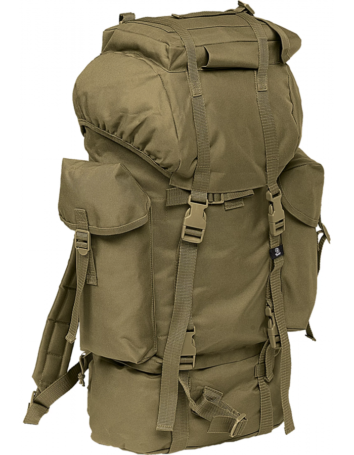 Tento robustní a velký vojenský batoh má objem až 65 litrů a má velké množství přihrádek pro maximální funkčnost. Prostorný hlavní oddíl rozšiřují oddíl na boty ve spodní části a pouzdro v horní části. Boky nabízejí dvě další přihrádky, vybavené vysoce kvalitními přezkami. Dva paralelní pásové popruhy s vysoce kvalitními klipsy stabilizují bojový batoh, zatímco polstrované a velikostně nastavitelné popruhy nabízejí schválené pohodlí při nošení. Vojenský batoh je vyroben z robustního nylonu odolného proti roztržení.