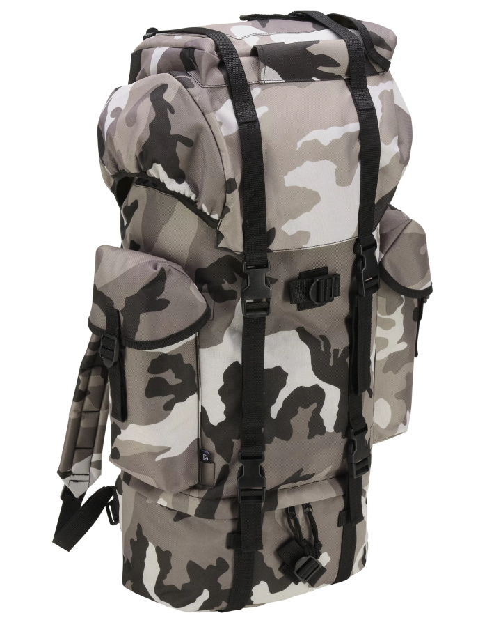 Tento robustní a velký vojenský batoh má objem až 65 litrů a má velké množství přihrádek pro maximální funkčnost. Prostorný hlavní oddíl rozšiřují oddíl na boty ve spodní části a pouzdro v horní části. Boky nabízejí dvě další přihrádky, vybavené vysoce kvalitními přezkami. Dva paralelní pásové popruhy s vysoce kvalitními klipsy stabilizují bojový batoh, zatímco polstrované a velikostně nastavitelné popruhy nabízejí schválené pohodlí při nošení. Vojenský batoh je vyroben z robustního nylonu odolného proti roztržení.
