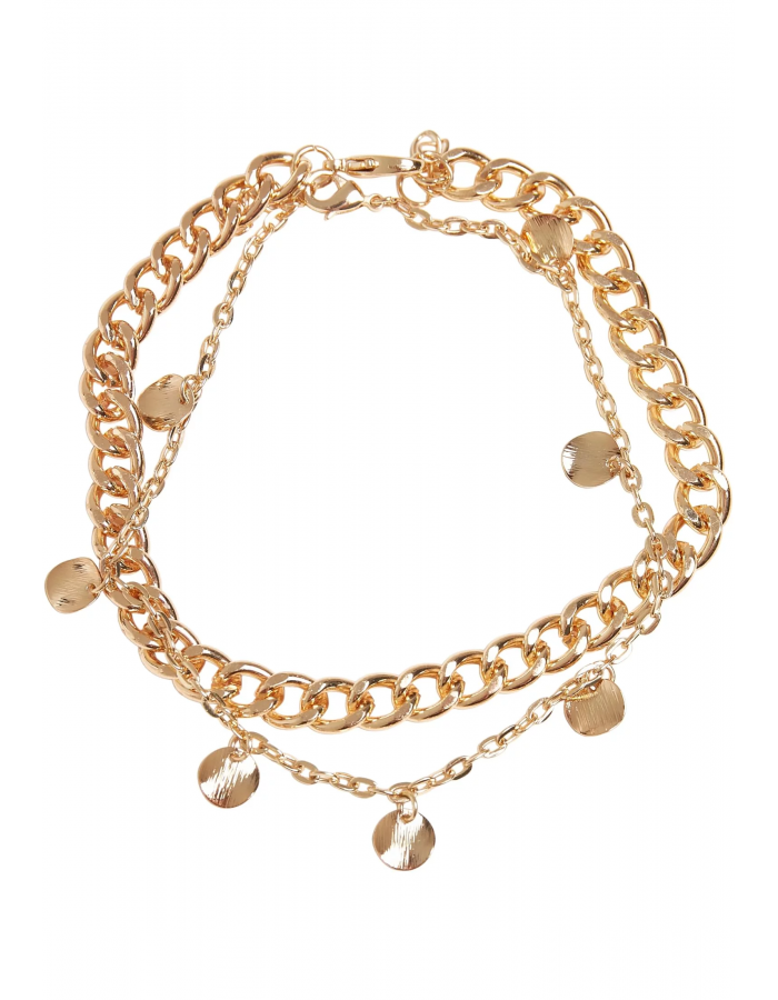 Tento jemný nákotník kombinuje silný obrubníkový řetízek s filigránovým kotevním řetízkem, který je opatřen sedmi malými kruhovými medailony. Módní šperk je vyroben ze železa a slitiny zinku a je dostupný ve dvou délkách: 22 cm nebo 25 cm, s 3 cm dlouhým prodlužovacím řetízkem.