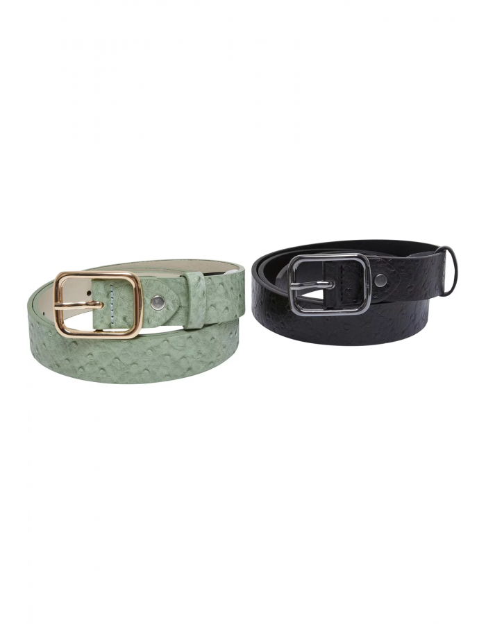 Extrémně elegantní pásek se vzhledem umělé pštrosí kůže se představuje v hodnotné sadě dvou kusů, každý pásek v jiné barvě. Robustní pásek, vyrobený s jemnou strukturou, která rozbíjí světlo různými způsoby, účinně upoutá pozornost. Je k dispozici ve velikostech S/M=105cm a L/XL=125cm.