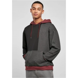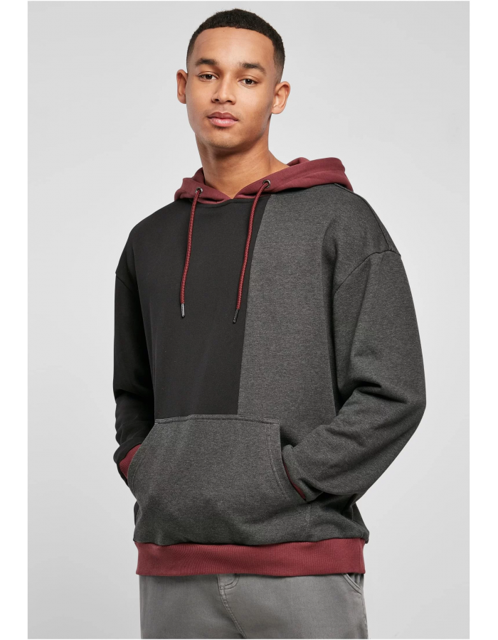 Výrazný kousek městské módy – tato pánská mikina s kapucí má asymetrický barevný blok. Obsahuje kapuci se stahovacími šňůrkami, klokaní kapsu a široké manžety na rukávech a lemu. Moderní nonšalance je dána oversize střihem, spadlými rameny a hladkou froté tkaninou, díky které je příjemné nosit.