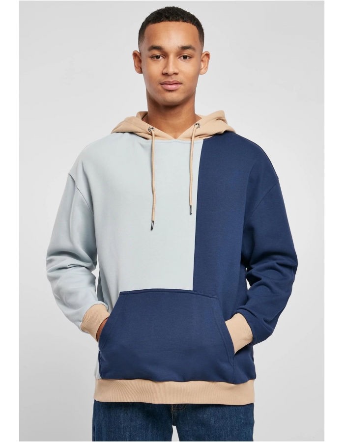 Výrazný kousek městské módy – tato pánská mikina s kapucí má asymetrický barevný blok. Obsahuje kapuci se stahovacími šňůrkami, klokaní kapsu a široké manžety na rukávech a lemu. Moderní nonšalance je dána oversize střihem, spadlými rameny a hladkou froté tkaninou, díky které je příjemné nosit.