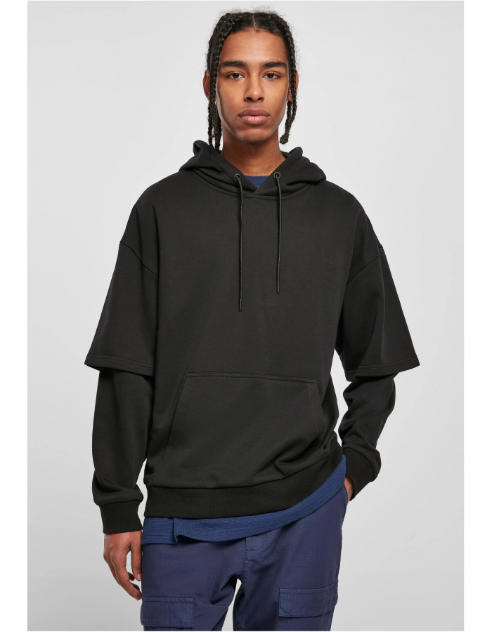 S dlouhými a krátkými rukávy na sobě je tato pánská mikina s kapucí zajímavou variací standardního modelu. Na palubě nechybí ani klasické prvky jako kapuce se stahovacími šňůrkami, klokaní kapsa a široké žebrované manžety na rukávech a lemu. Mikina s kapucí je pohodlného oversize střihu se spadlými rameny a je vyrobena z hladké a příjemné tkaniny na nošení potu.