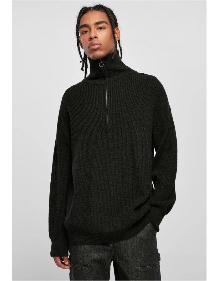 Pánský pletený svetr zaujme vysokým stojáčkem s kovovým zipem a dlouhým předním výstřihem na zip. Vzhled doplňuje velký žebrovaný úplet z viskózy, polyesteru a nylonu a zakončený oversized střihem se spadlými rameny a širokými žebrovanými manžetami na rukávech a lemu.