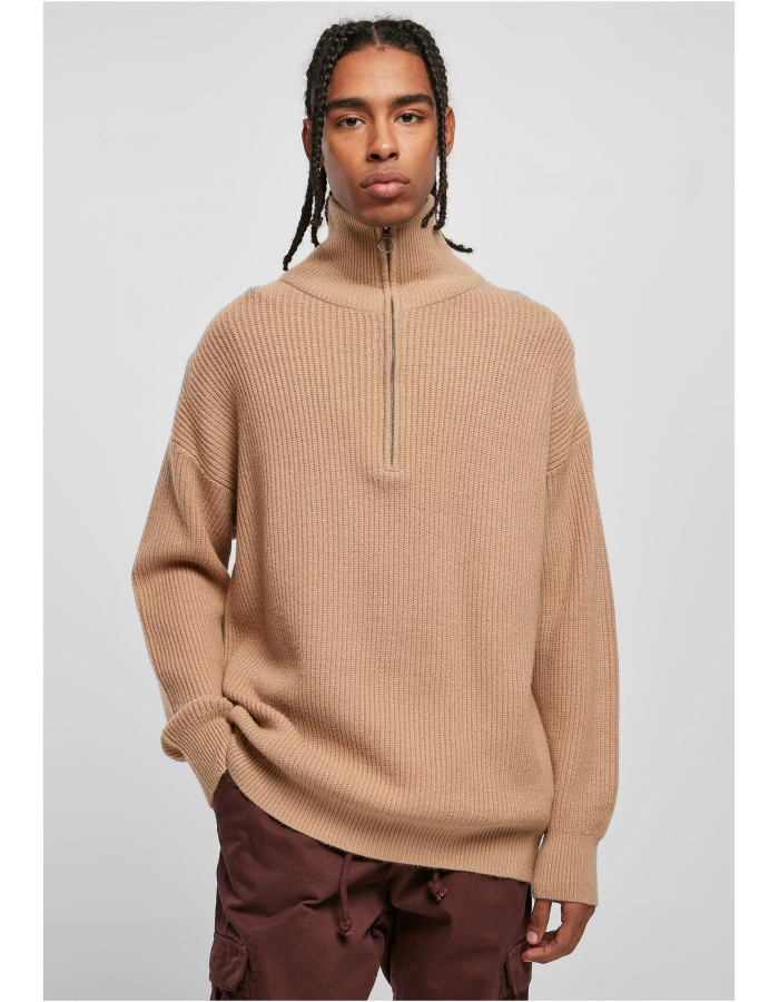 Pánský pletený svetr zaujme vysokým stojáčkem s kovovým zipem a dlouhým předním výstřihem na zip. Vzhled doplňuje velký žebrovaný úplet z viskózy, polyesteru a nylonu a zakončený oversized střihem se spadlými rameny a širokými žebrovanými manžetami na rukávech a lemu.