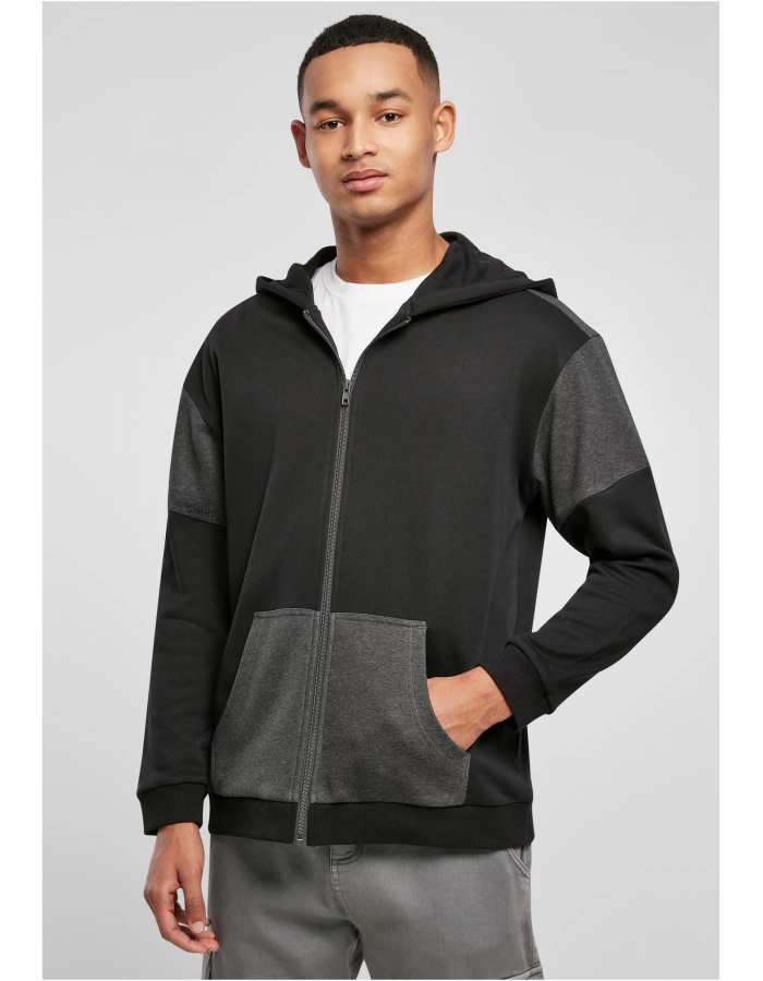 Pánská mikina s kapucí na zip má barevně kontrastní vsadky na horní části paží a také kontrastní klokaní kapsu. Pohodlná kapuce a široké manžety na rukávech a lemu završují trendy kousek pánské módy. Mikina s kapucí na zip je vyrobena z měkké froté tkaniny a má oversize střih, který poskytuje optimální pohodlí při nošení.