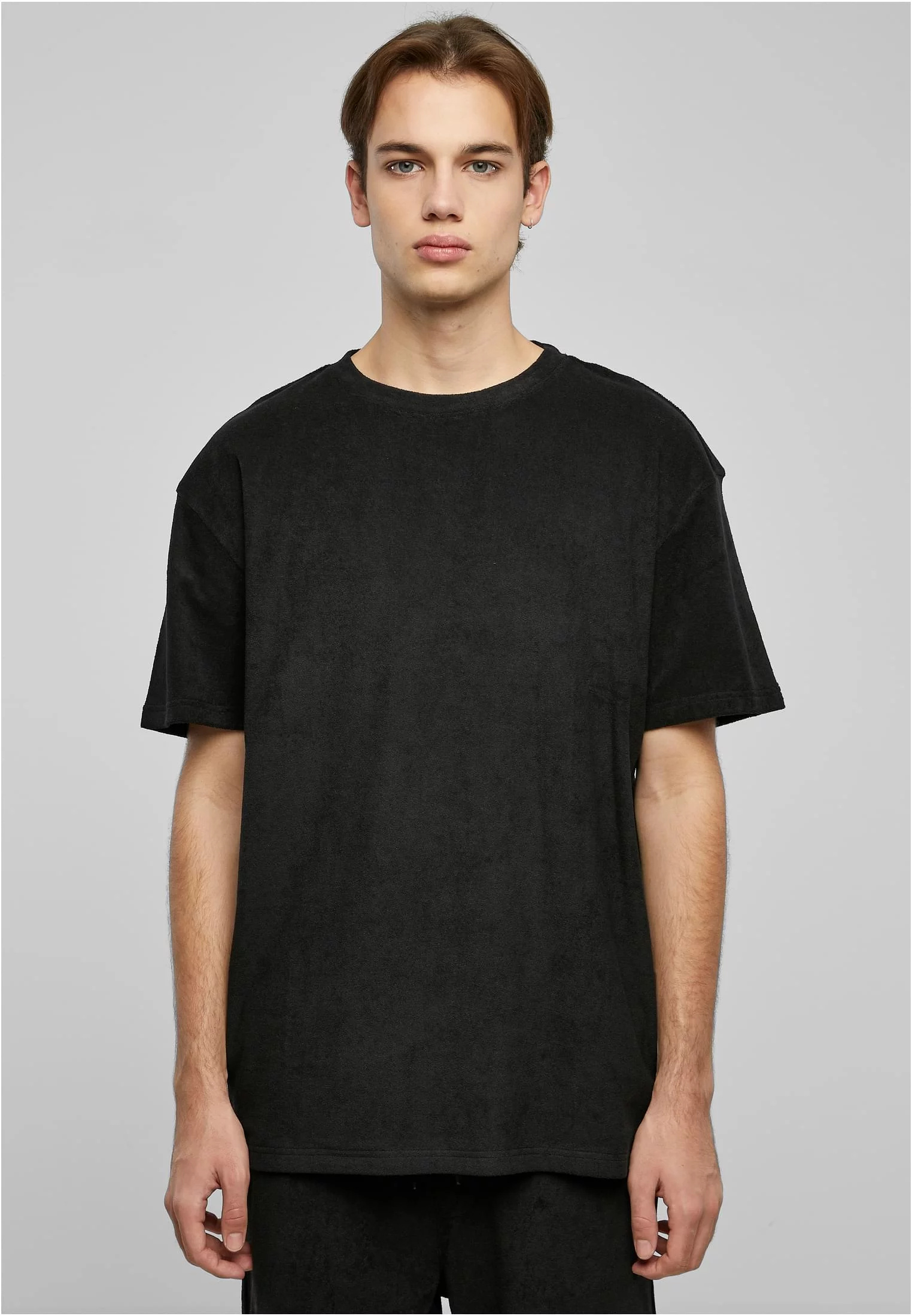 Jednobarevné pánské tričko je navrženo v ležérním oversize střihu se spadlými rameny, stejně jako s klasickým výstřihem a rukávy, které končí těsně nad loktem. Jeho zvláštní pohodlí při nošení je odvozeno od použitého ručníkového bavlněného materiálu.