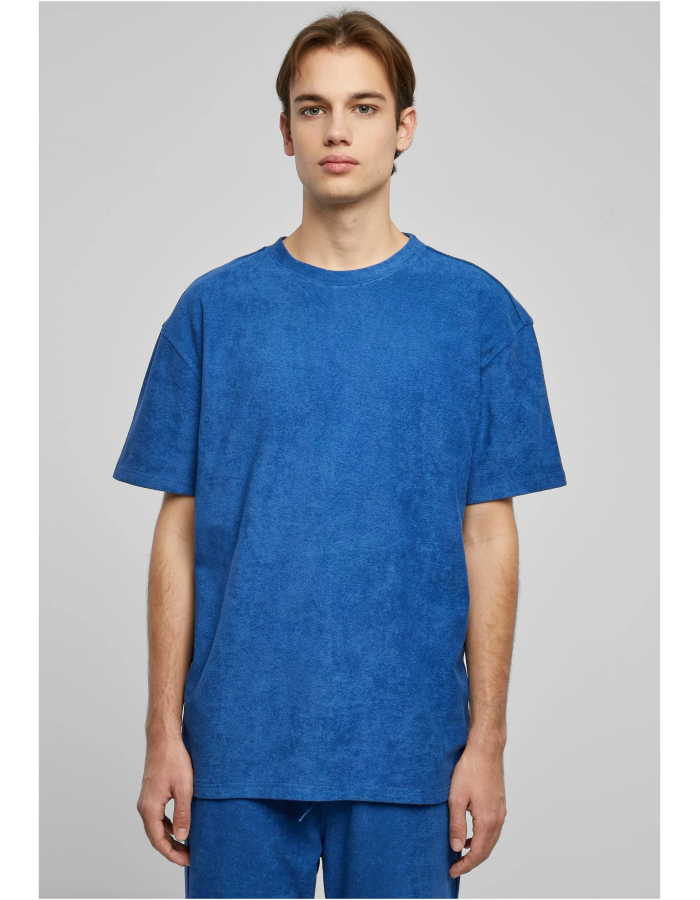 Jednobarevné pánské tričko je navrženo v ležérním oversize střihu se spadlými rameny, stejně jako s klasickým výstřihem a rukávy, které končí těsně nad loktem. Jeho zvláštní pohodlí při nošení je odvozeno od použitého ručníkového bavlněného materiálu.