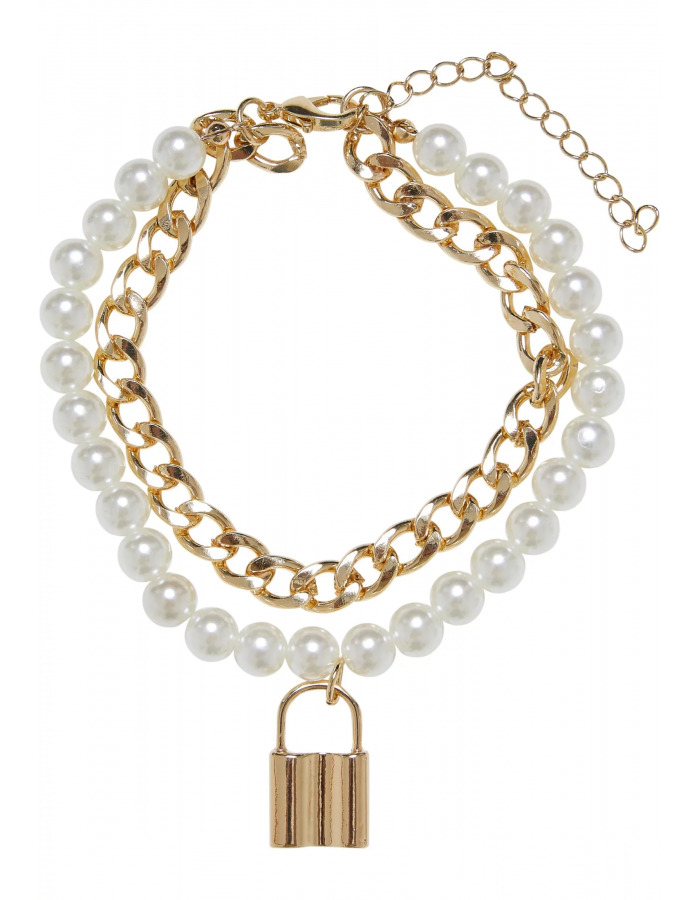 Tento dvouřadý náramek, který slouží jako nápadný doplněk, upoutá pozornost a skládá se ze dvou různých řetízků. Základní zlacený řetízek doplňuje ozdobný perlový řetízek se zlatým zámkem jako speciálním trikem. Atraktivní náramek je dostupný ve dvou různých velikostech.