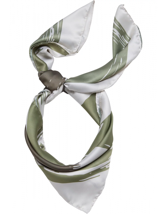 Šátek je vyroben z hladkého polyesteru a stylizovaný s designem širokých tahů štětce v různých tlumených barvách. Jeho praktický tvar umožňuje nošení jako šátek kolem hlavy nebo jako šátek. Šátek má standardní obdélníkový rozměr v rozměrech 80 cm x 80 cm.