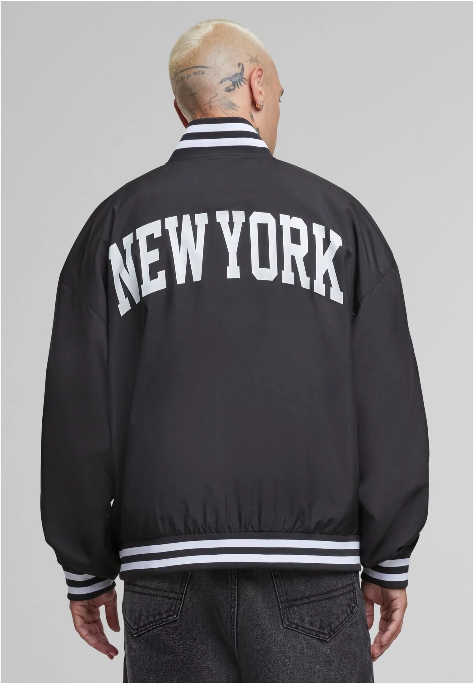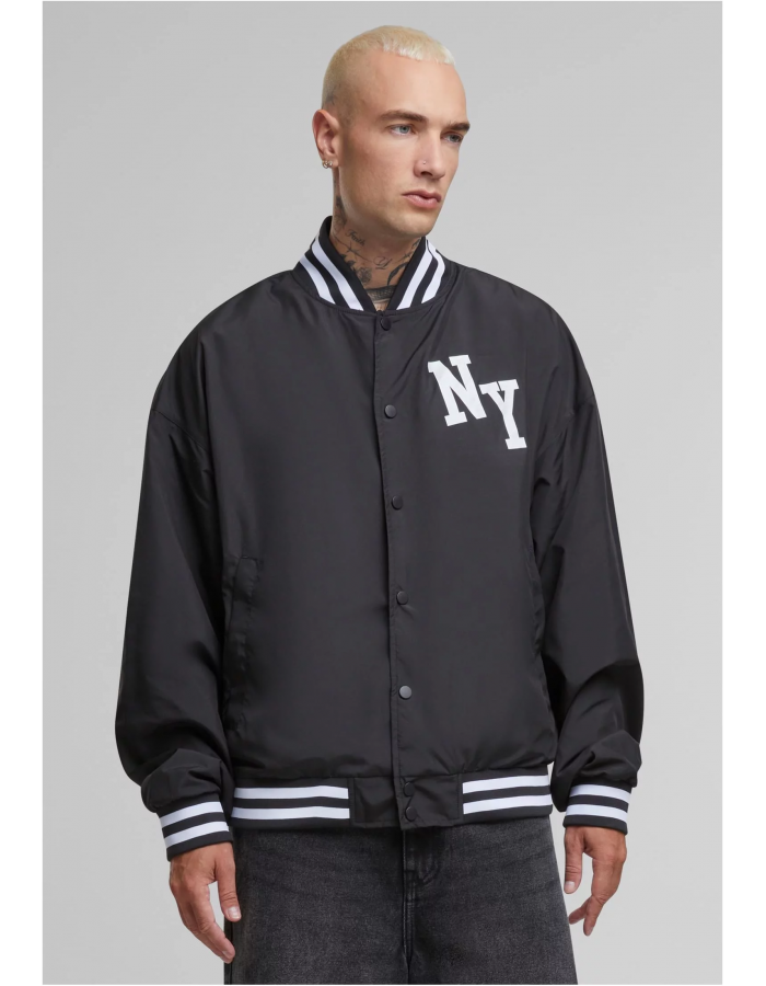 Baseballová bunda ve stylu varsity s nápisem "NY" na přední straně a velkým nápisem "New York" na zadní straně. Bunda má klasické pruhy na límci, manžetách a spodním lemu v černobílé kombinaci. Zapínání je na druky. Tento design bundy je sportovní, inspirovaný americkým univerzitním stylem a ideální pro ty, kteří preferují pohodlné a stylové oblečení s odkazem na městskou kulturu New Yorku.