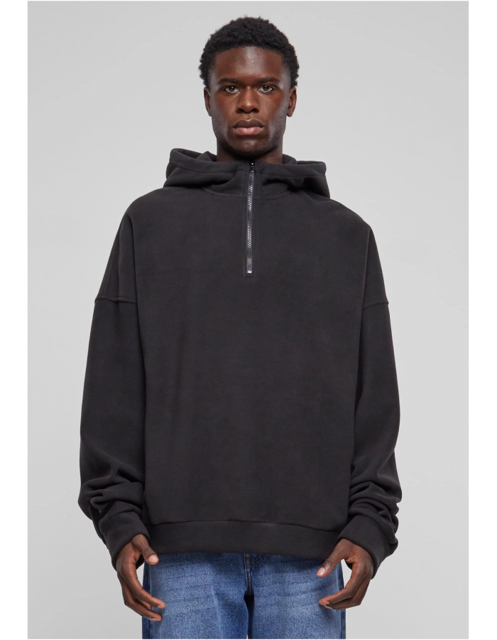 Tato pánská fleesová mikina v černé barvě je skvělým kouskem pro ty, kteří preferují pohodlí a moderní oversized střih. Mikina je vyrobena z měkkého fleecového materiálu, který poskytuje tepelný komfort. Poloviční zip umožňuje snadné oblékání a regulaci teploty, zatímco kapuce dodává extra ochranu před chladem. Tento model je ideální pro volnočasové nošení, ať už doma, nebo venku.