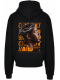 Mikina s kapucí má na přední straně malý potisk ptáka ve světle hnědé a bílé barvě, což dodává jednoduchý, ale výrazný prvek. Zadní strana je vysoce stylizovaná, s velkým portrétem muže, který má na hlavě korunu z trní, což může symbolizovat sílu a odolnost. Kolem portrétu je nápis v oranžové barvě s motivující zprávou „The fight is hardest“. Tento design působí silně a inspirativně.