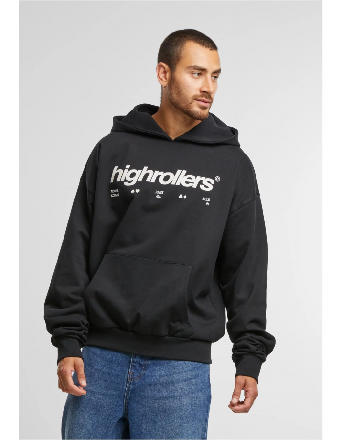 Na přední straně mikiny je bílý nápis „highrollers®“ ve výrazném fontu. Pod tímto hlavním nápisem jsou malé texty a symboly karet (srdce, kříže) s výrazy „ALWAYS COMMIT,“ „RAISE ALL,“ a „BOLD IN.“ Mikina má klasický střih s klokaní kapsou na přední straně a dlouhými rukávy s pružnými manžetami.