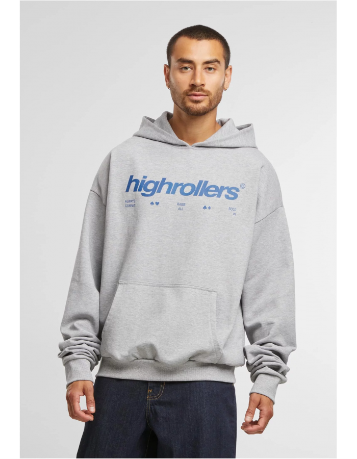 Mikina s kapucí a klokaní kapsou na přední straně. Na hrudi je modrý nápis "highrollers," pod kterým jsou malé symboly karetních barev (srdce, kára, piky) spolu s nápisy "Always Commit," "Raise All," a "Bold In," rozmístěnými vodorovně. Mikina má volný střih a působí moderně a pohodlně. Design je jednoduchý a stylový, ideální pro neformální nošení s lehce herní a riskantní tematikou, která odkazuje na svět hazardu.