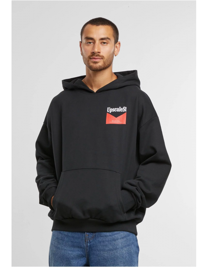 Tato mikina s kapucí má moderní a odvážný design. Na přední straně je malý nápis "UpscaleSt". Zadní strana mikiny je výrazněji zdobená – dominuje zde velký nápis "Live Bold" nad černobílým obrázkem jezdce na koni. Pod tímto motivem je text „Live tough, push hard, exceed every line“, který dodává mikině inspirativní nádech. Tento design je ideální pro ty, kteří chtějí vyjádřit sebevědomí a odhodlání prostřednictvím svého oblečení.
