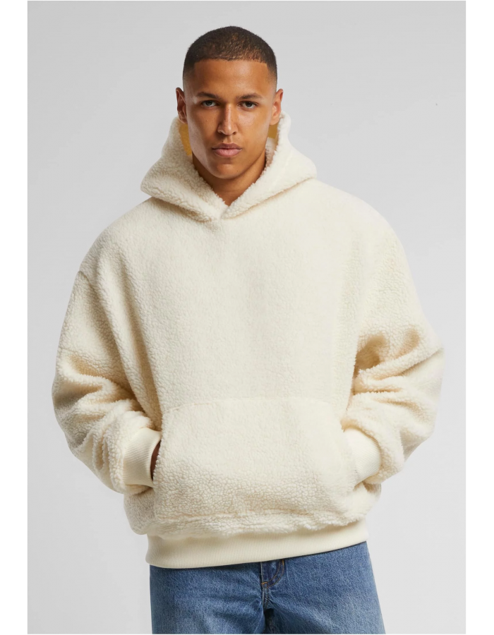 Tato mikina je ve stylu "oversize" s kapucí a klokaní kapsou. Je vyrobena z měkkého, nadýchaného materiálu, který připomíná umělou kožešinu nebo beránek. Elastické manžety a spodní lem poskytují pohodlné přizpůsobení. Mikina působí velmi teple a komfortně, ideální na volný čas či neformální outfity.