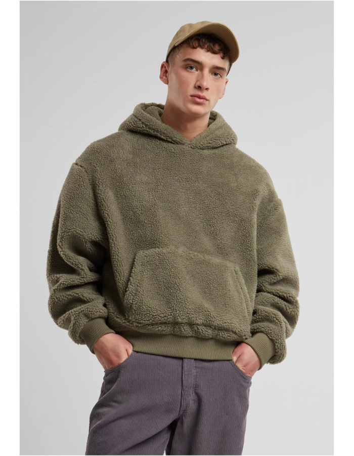 Tato mikina je ve stylu "oversize" s kapucí a klokaní kapsou. Je vyrobena z měkkého, nadýchaného materiálu, který připomíná umělou kožešinu nebo beránek. Elastické manžety a spodní lem poskytují pohodlné přizpůsobení. Mikina působí velmi teple a komfortně, ideální na volný čas či neformální outfity.