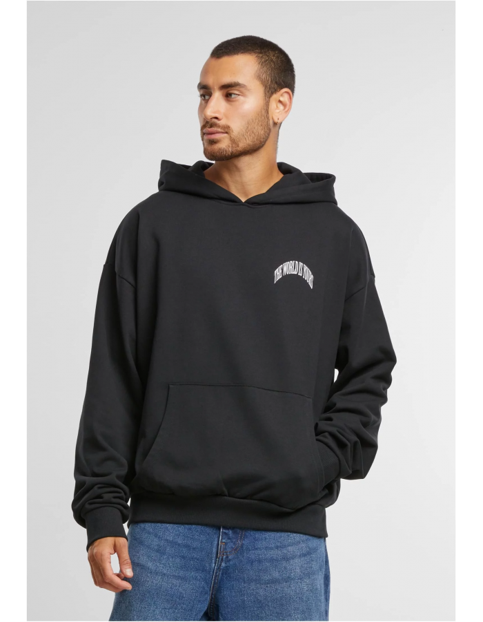 Mikina má černou barvu a volnější střih, je vybavena kapucí a klokaní kapsou na přední straně. Na hrudi je malý bílý nápis "The World Is Yours," umístěný ve středu. Zadní strana mikiny má větší potisk, který opět obsahuje nápis "The World Is Yours," spolu s grafikou poháru drženého třemi postavami. V horní části zadního potisku je menší text "Bold & Wild" a logo "W". Celkový design mikiny působí moderně a stylově, s důrazem na minimalistické detaily a výrazné grafické prvky na zadní straně.