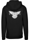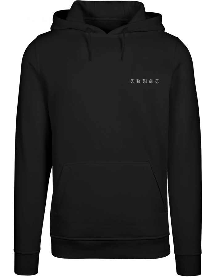 Na přední straně je malý nápis "TRUST" vyvedený ve staroanglickém stylu písma. Zadní strana mikiny je ozdobena větším motivem bílého holuba s roztaženými křídly a pod ním opět nápisem "TRUST". Mikina má klasický design s kapucí a klokaní kapsou, což ji dělá pohodlnou pro běžné nošení. Rukávy a spodní lem jsou zakončeny elastickými manžetami pro lepší pohodlí.